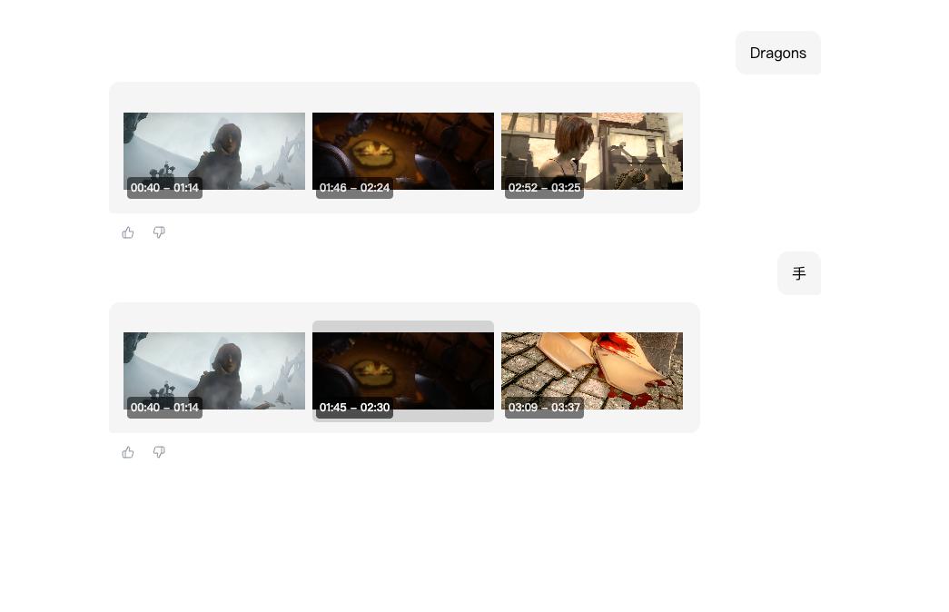 比如上面这个官方视频里,我搜索里面有龙的画面与帧数,都可以罗列出来,输入手的视频则可以把有手的视频也能够输出。