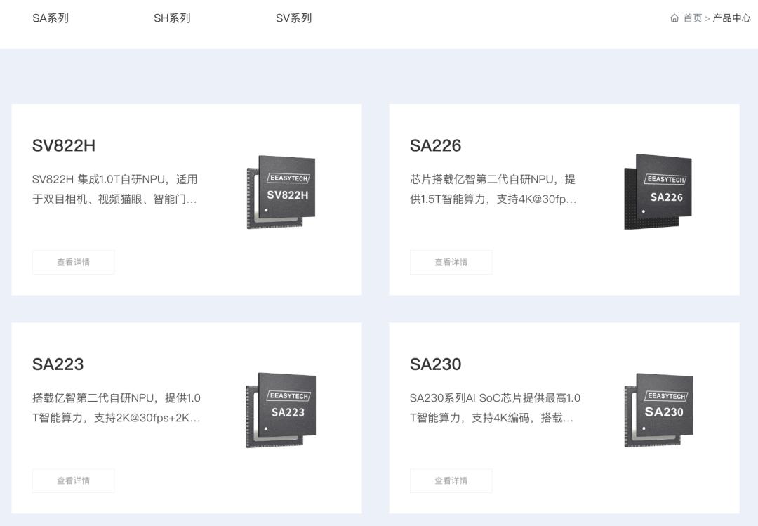 该公司已经形成SA、SH、SV三大系列边缘侧、端侧AI SoC芯片产品矩阵,覆盖边缘侧/端侧AI的多种应用场景。2019年亿智电子就量产发布了集成首代自研NPU(神经网络处理器)的系统级AI芯片。2020年,亿智电子联合创始人兼COO吴浪曾透露,亿智电子已有超百万颗芯片量产落地。