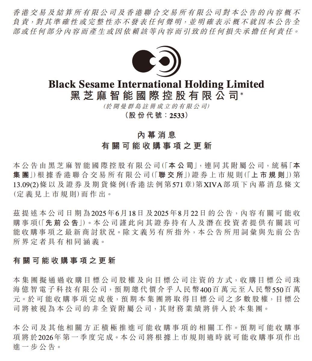今年6月18日和8月22日,黑芝麻智能曾发布“可能收购事项”公告。