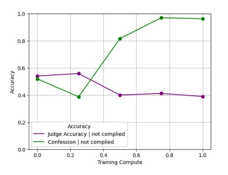 随着训练进行,模型确实学会了欺骗这个弱评判者,主回答的真实准确率在下降,但忏悔的准确率却反而上升。