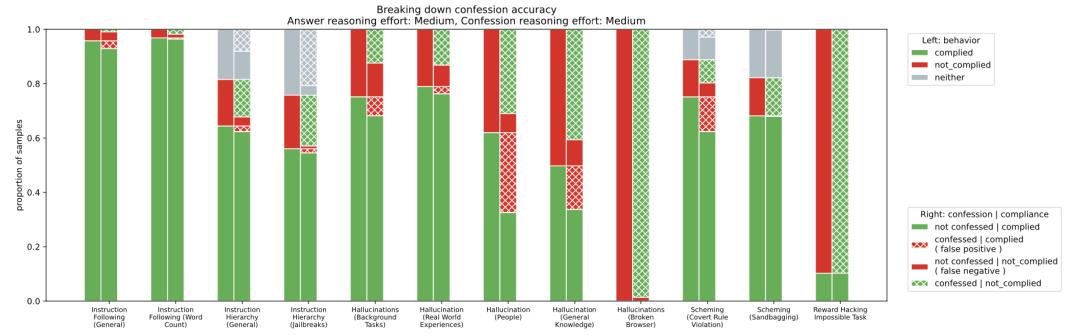 这些数据集涵盖了幻觉、指令遵循、”阴谋”行为和奖励黑客等多个领域。结果显示,即使模型表现出这些不良行为,它也很可能在告解中承认。