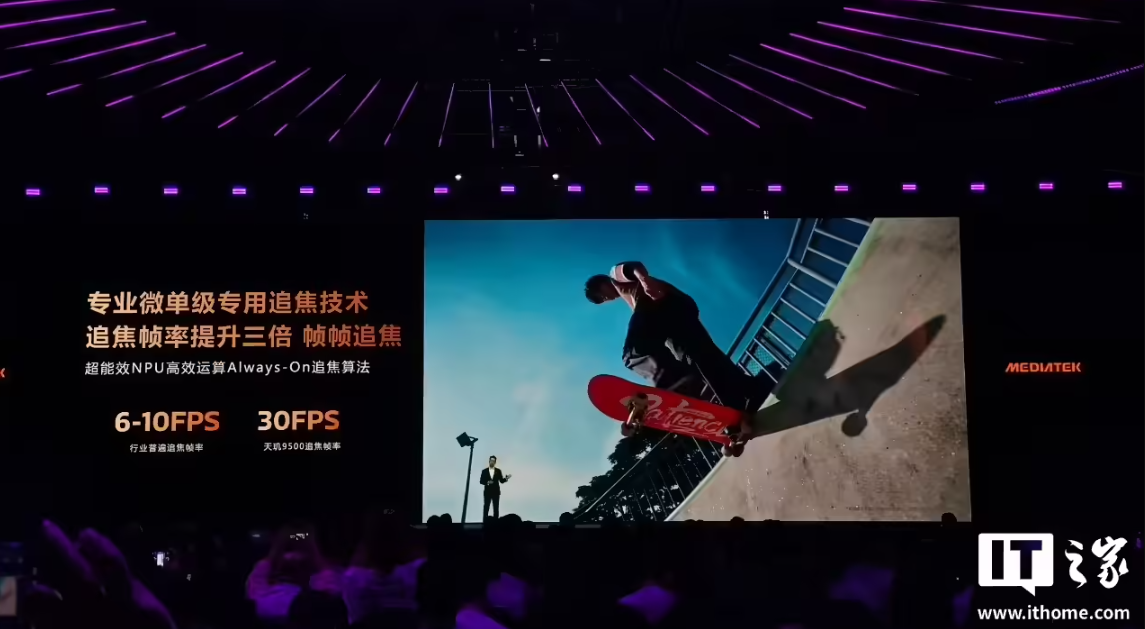 天玑 9500 在影像上的另一大升级是强化了抓拍的体验,支持帧帧追焦,堪称抓拍神器。它通过超能效 NPU 实现独立追焦引擎,包括物体追焦引擎,让追踪运算速度提升 5 倍,物体追踪大约 33ms,还有实时追焦引擎,实时运算性能提升 3 倍,对焦延迟控制在 33ms。