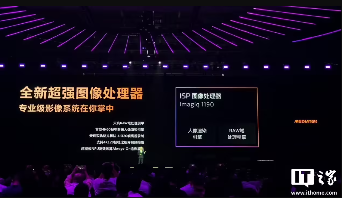 具体来说,天玑 9500 这次搭载了一款全新的 ISP 图像处理器 Imagiq 1190,配合前面提到的超能效 NPU,再加上传感器中枢的深度协同,联发科为天玑 9500 打造了一个专业级的影像系统,在画质算法、4K 防抖、电影人像以及高规格视频录制等场景都有全面的提升。