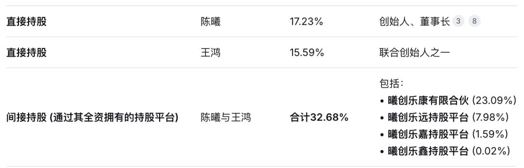 创始团队(陈曦、王鸿及员工平台)持股约65.51%,对应约44.0亿元。这意味着,外部投资者用总计约23.2亿元的出资,换取了约34.49%的股份。