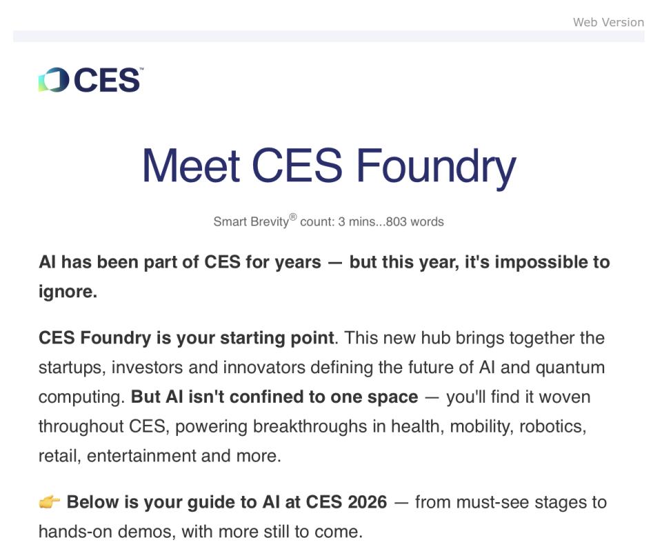 就在今天,雷科技CES2026报道团成员,收到了 CTA(美国消费者技术协会)发来的名为「相遇 CES Foundry」的主题邮件。
