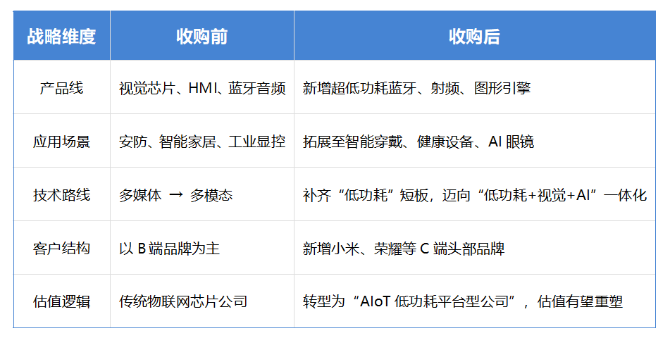收购完成后,安凯微将快速补齐在智能穿戴等消费电子领域的产品短板,形成“安防+穿戴+工业”多场景覆盖的产品矩阵,进一步拓展在物联网终端市场的渗透率。