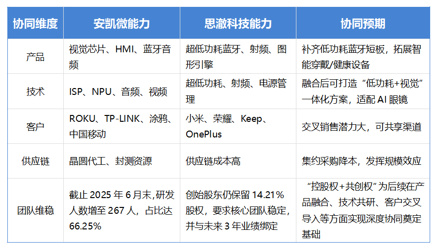差异化估值令早期投资人保本退出体现市场对思澈科技技术实力的认可,契合芯片设计企业“重人才、轻资产”的逻辑。保留少数股权并非仅为财务审慎,更彰显双方对“1+1>2”协同效应的信心——安凯微看重思澈在超低功耗、无线连接及消费电子生态的优势,思澈则认可安凯微在视觉处理、B端客户和供应链的能力。这种“控股权+共创权”的治理模式,为产品融合、技术共研与客户协同奠定制度基础,推动整合从物理叠加走向化学反应。