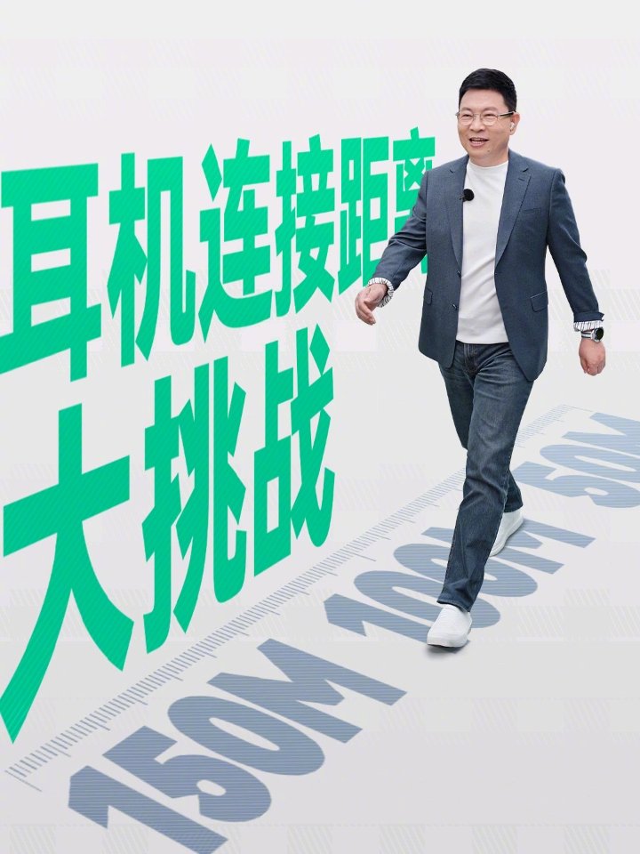 测试中,余承东佩戴耳机播放歌曲并远离手机,在直线距离 150 米处仍保持稳定音频传输。