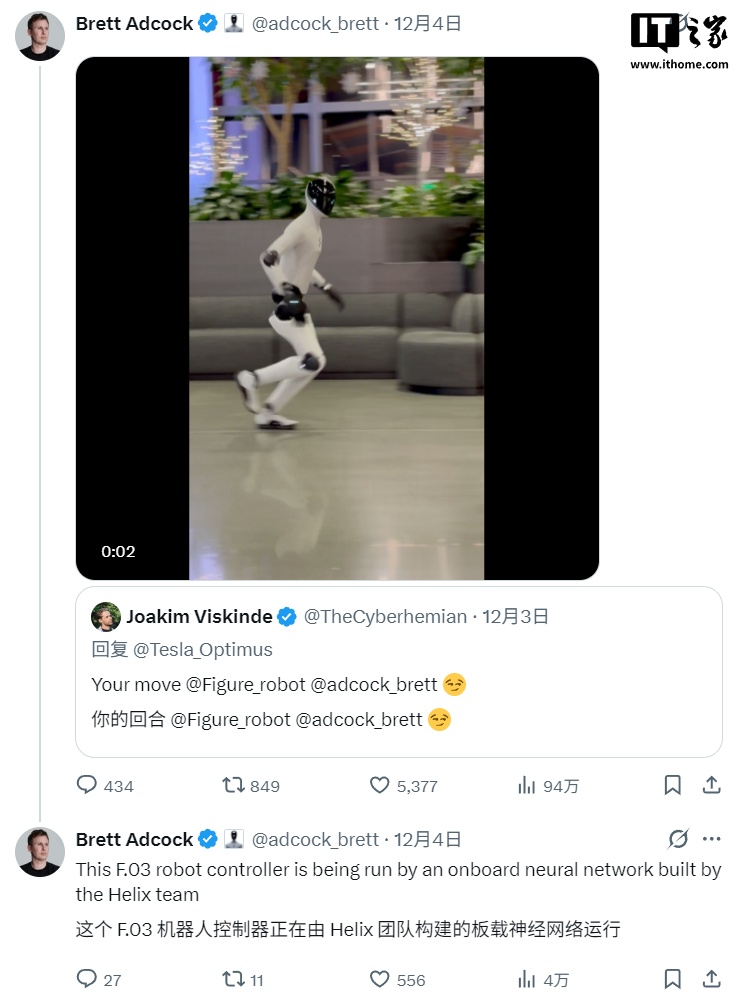 随后,特斯拉的竞争对手 Figure AI 也不甘示弱,Figure AI 创始人 Brett Adcock 在昨日晒出了一段 Figure 03 跑步的视频,而且是折返跑。