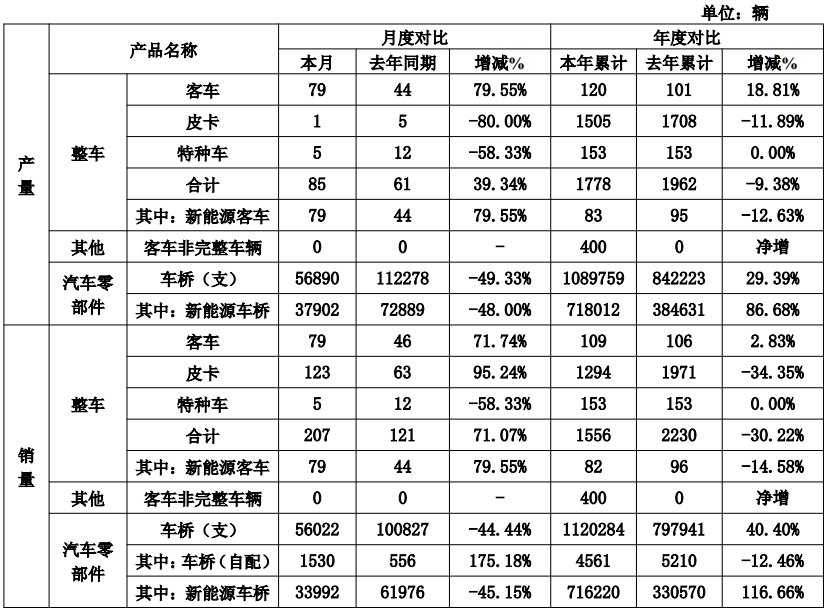 销量方面,11月,公司整车销量合计207辆,较去年同期121辆增长71.07%;本年累计销量1556辆,较去年累计2230辆下降30.22%。具体来看,客车销量79辆,去年同期46辆,同比增长71.74%,本年累计销量109辆,较去年累计106辆增长2.83%;皮卡销量123辆,去年同期63辆,同比大幅增长95.24%,本年累计销量1294辆,较去年累计1971辆下降34.35%;特种车销量5辆,去年同期12辆,同比下降58.33%,本年累计销量153辆,与去年累计持平。