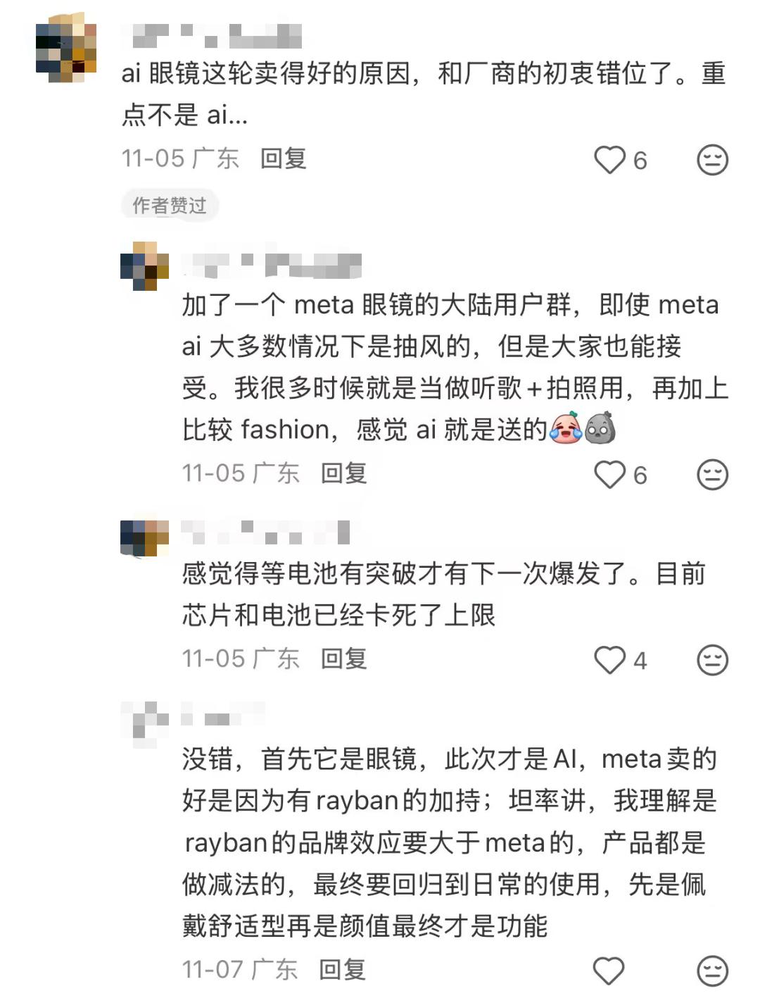 这些功能离用户想象的虚实互动还有点差距,有用户戏称为AI眼镜的“冰箱彩电大沙发”,也能提供使用和情绪价值。