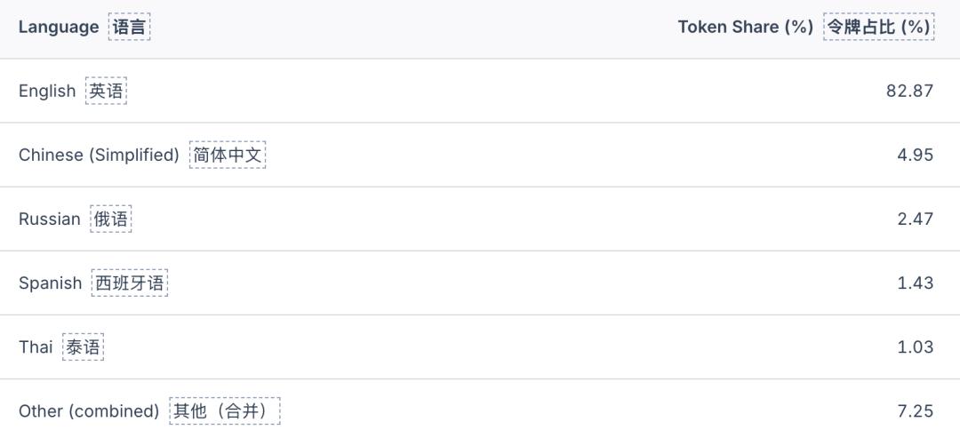 但简体中文以近5%的份额位居第二,不仅超过了西班牙语和俄语,也侧面印证了中文AI社区的活力。