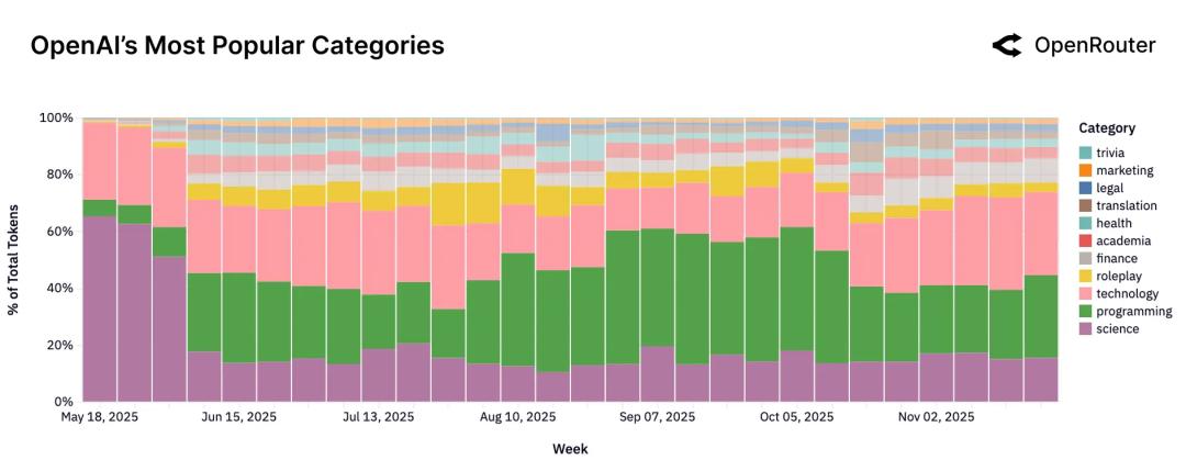 OpenAI:使用重心逐渐转向编程与技术任务,角色扮演和日常闲聊大幅减少。