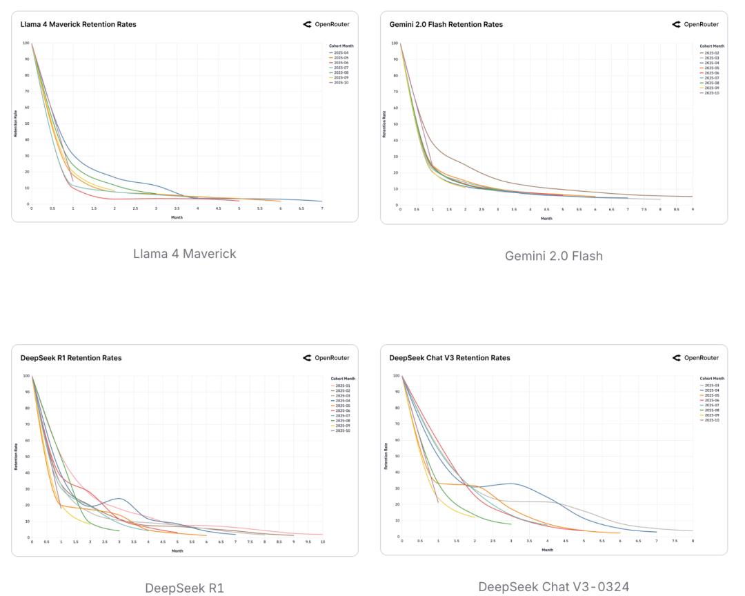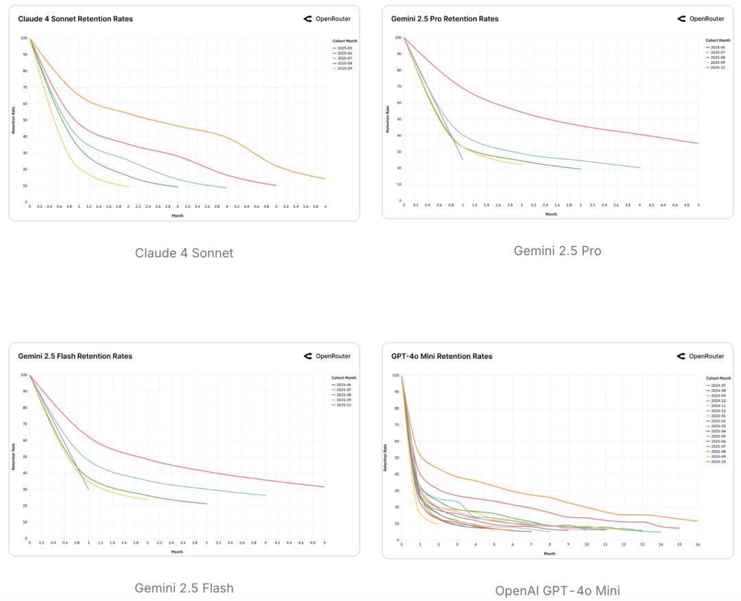 赢家:GPT-4o Mini、Claude 4 Sonnet和Gemini 2.5 Pro在发布初期都形成了明显的基石群组,留存率曲线在高位企稳。