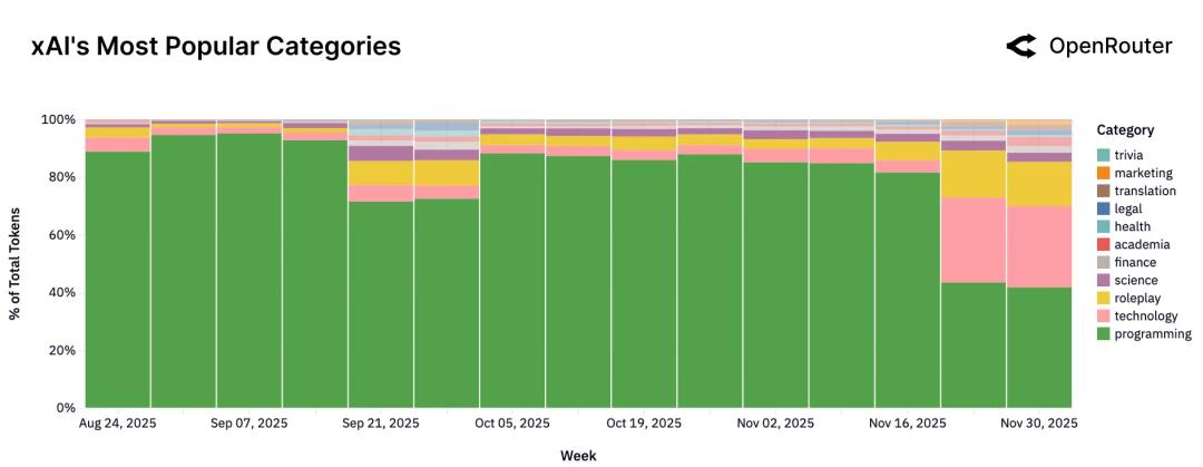 xAI:代币使用高度集中于编程领域,技术应用、角色扮演及学术用途在十一月下旬显著增长。