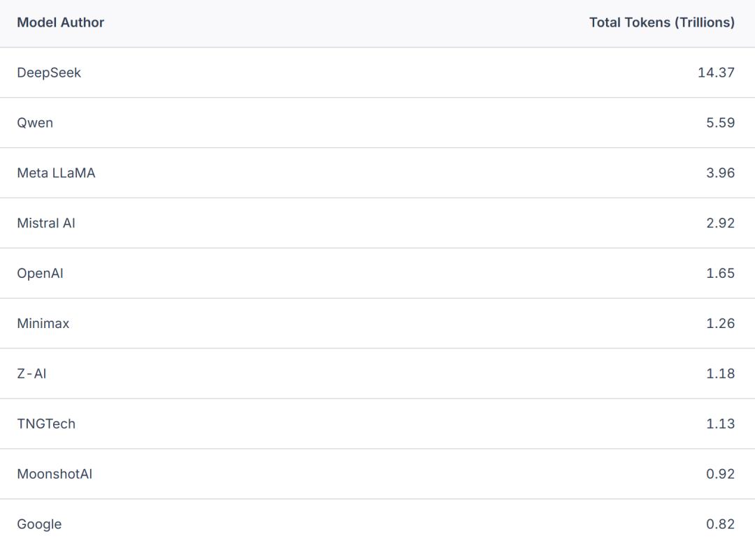 用一句话概括:去年是「一个DeepSeek,打遍OSS」;今年变成了「五六个开源模型,各自都有稳定流量」。
