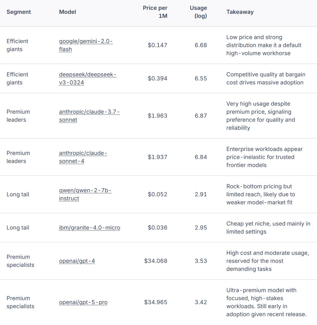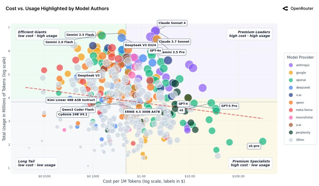 高级领导者(Premium leaders):成本不低,但使用量仍然很高,比如Claude Sonnet 4、Gemini 2.5 Pro等。