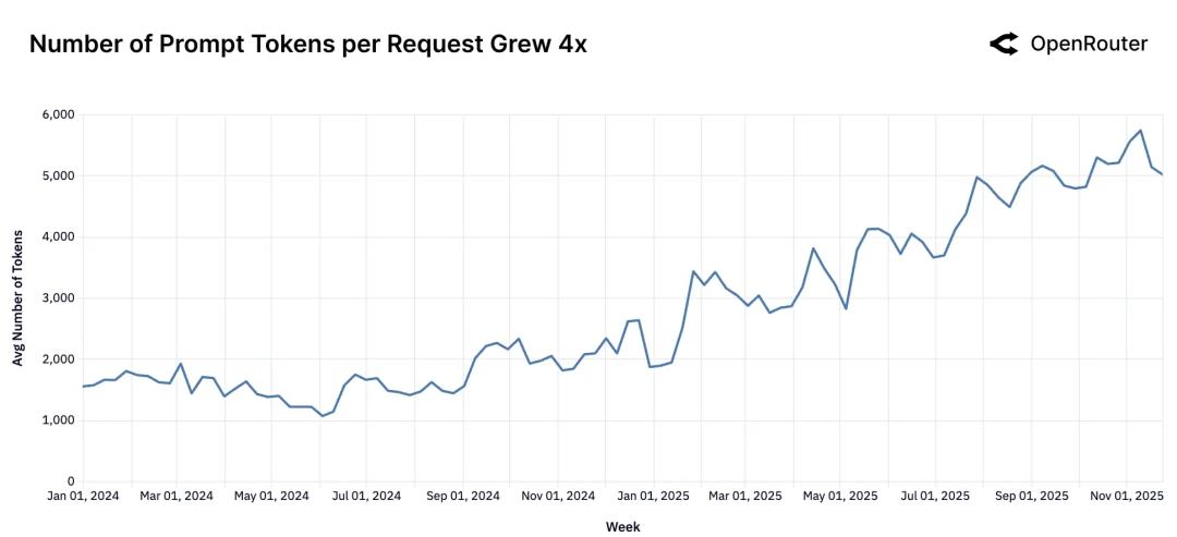 提示词数量呈上升趋势。自2024年初以来,平均提示词长度已增长近四倍,反映出工作负载对上下文依赖度的显著提升。
