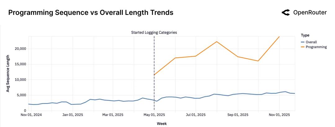 其中,编程中的序列长度与整体对比。编程提示词的系统性更长且增长更快。