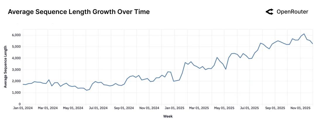 上图显示,过去20个月中平均序列长度增长超过三倍,从2023年末的不足2000个标记增至2025年末的5400个以上。