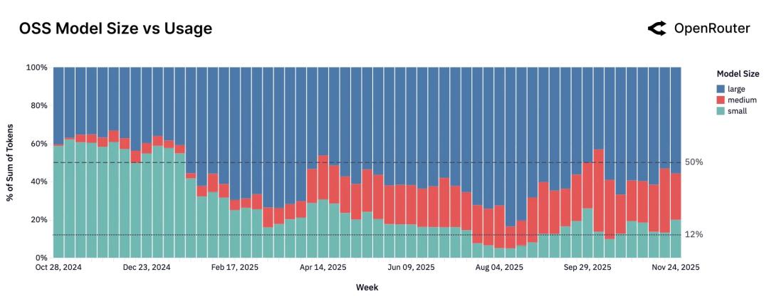 开源模型规模与使用情况对比。每周由小型、中型和大型模型处理的开源总Token量占比。百分比按每周开源总使用量进行归一化计算。