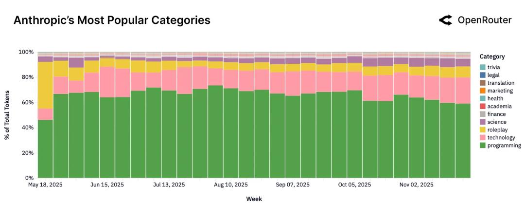 Anthropic:主要用于编程和技术任务(占比超过80%),角色扮演使用极少。