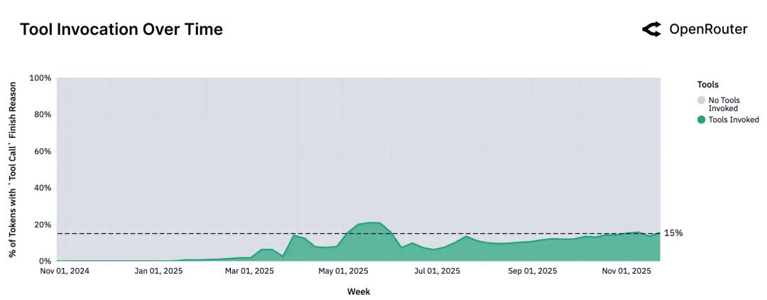 虽然闭源模型依然占据主导地位,但开源模型的使用量已稳步增长至总流量的30%左右。