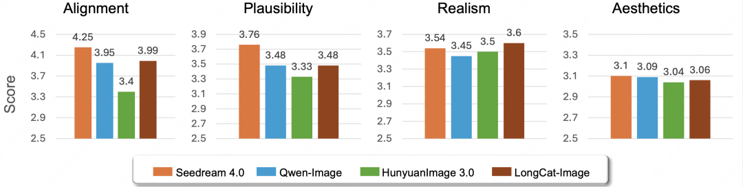 在衡量模型的通用能力时,我们始终将用户的真实体验放在首位。为此,我们采用业界公认的主观评价方法,对 LongCat-Image 在“文生图”与“图像编辑”两大核心场景下的表现进行了系统评估。