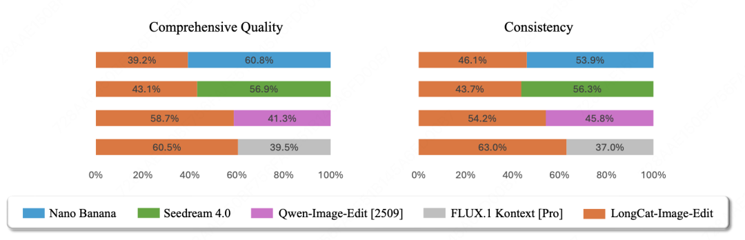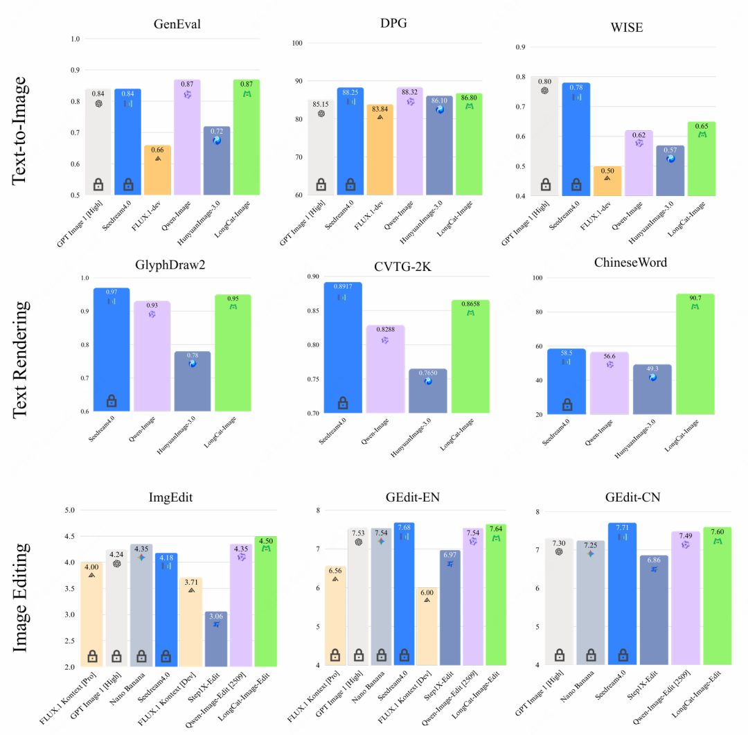 在文生图方面采用大规模的人工主观评分(MOS)方法,核心覆盖文本-图像对齐、视觉合理度、视觉真实度、美学质量 4 个维度,LongCat-Image 的真实度相比主流开闭源模型表现出色,同时在文本-图像对齐与合理度上达到开源 SOTA 水平。在图像编辑方面采用严格的并列对比评估(Side-by-Side, SBS)方法,聚焦于综合编辑质量、视觉一致性这两个用户体验的维度,评测结果表明,LongCat-Image 虽然与 Nano Banana、Seedream 4.0 等商业模型存在一定差距,但显著超越了其他开源方案。