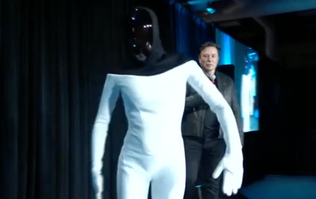 马斯克在2021年特斯拉AI Day上,让一位身着紧身衣的皮套人,上台模仿特斯拉构想出的人形机器人。