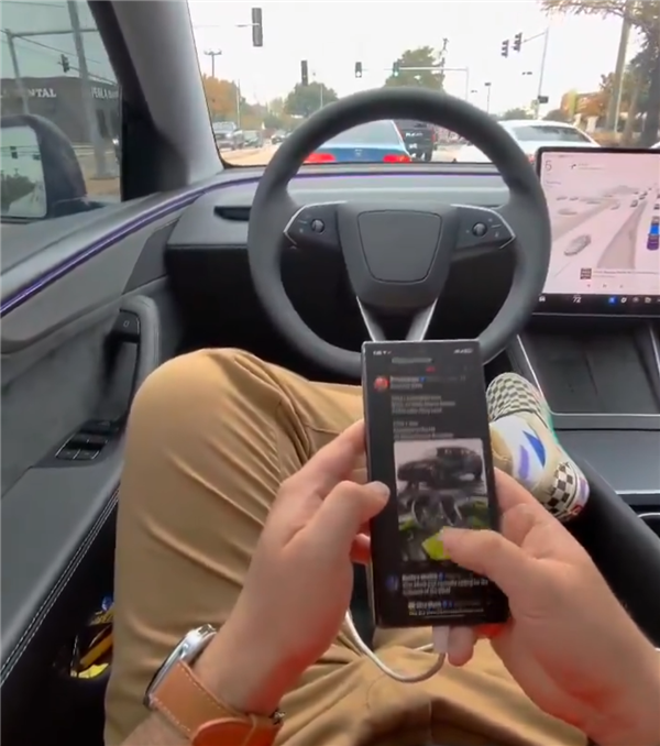 视频中,车主设置目的地后,就开启了FSD让车辆在城市道路中自动驾驶。期间,他坐在主驾位上一直在玩手机。