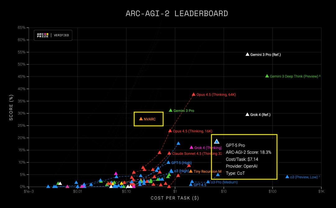 ARC-AGI 2最新成绩,4B小模型NVARC以27.64%的公开榜成绩力压GPT-5 Pro 18.3%登顶榜首。