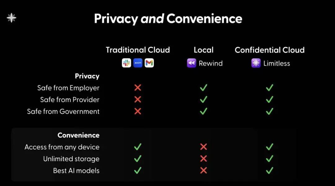 Limitless 首发的隐私云,则能做到平衡二者关系,在保证云端服务的前提下,把所有个人资料的查看、揭秘全都留在了本地,只有个人认证后,私人数据才能被浏览。