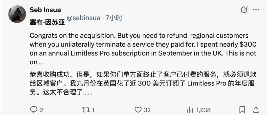 现有用户无需再支付订阅费用,并可免费获得 Unlimited(无限服务)计划。与此同时,用户将无法再使用 Limitless Desktop 应用或 Limitless Web 应用录制会议,公司还计划逐步停止 Rewind 应用的服务。