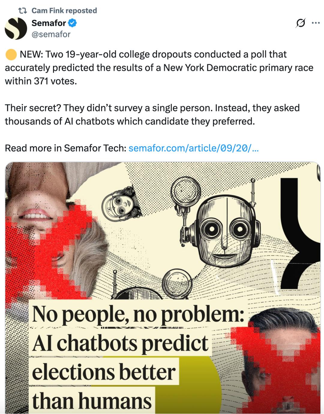 值得一提的是,据外媒Semafor,在2024年美国纽约州民主党初选前,芬克和科曾用他们的产品进行了“民意调查”,通过与成千上万的AI聊天机器人互动,他们准确预测了纽约州民主党初选结果,预测数据与实际票数仅相差不到371票。