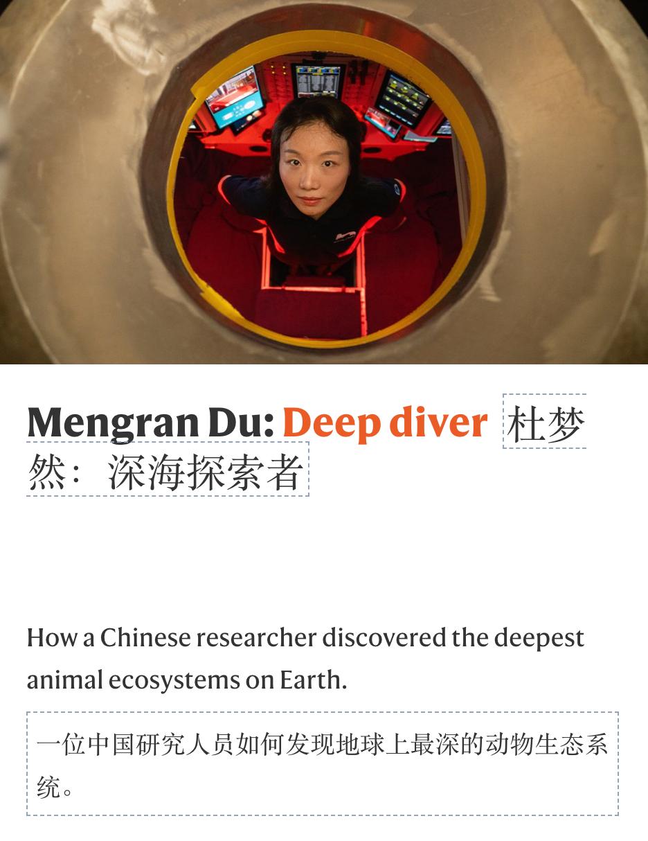 中国科学院深海科学与工程研究所研究员杜梦然被《自然》称为「深潜者」,榜单强调她在海平面9000米以下发现了地球上最深的动物生态系统,在海洋最底层「见证科学界前所未有的景象」。