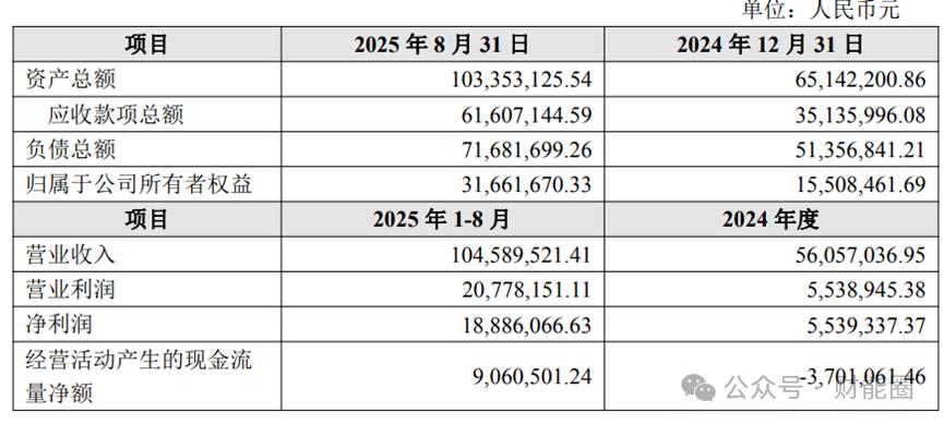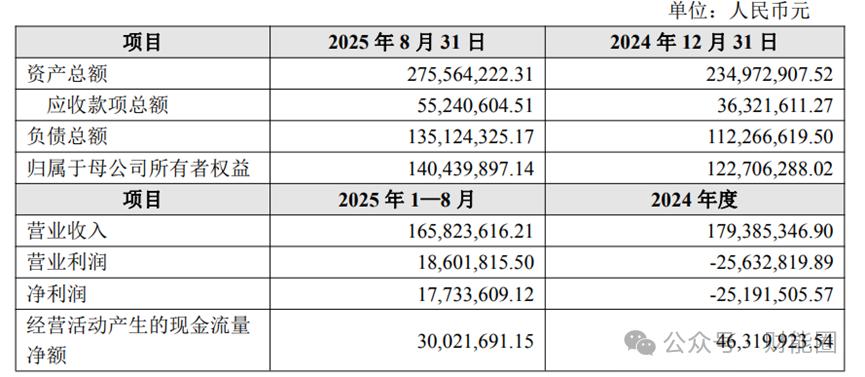 财务数据显示,公司截止报告期末的资产总额为1.03亿元,归属母公司所有者权益3166万元。业绩方面,2024年其实现营收5606万元,净利润554万元;今年前8个月实现营收1.05亿元,净利润1887万元。