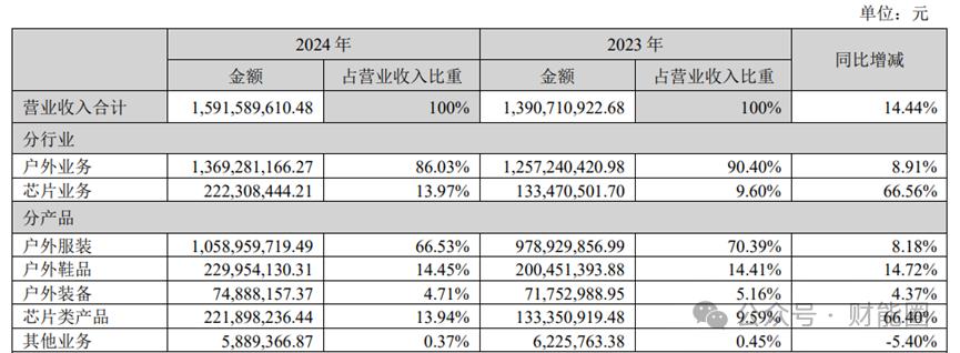 通过陆续收购3家芯片公司,探路者形成“户外+芯片”双主业发展。2024年公司的15.92亿元营收中,户外业务占比86.03%,芯片业务占比13.97%。