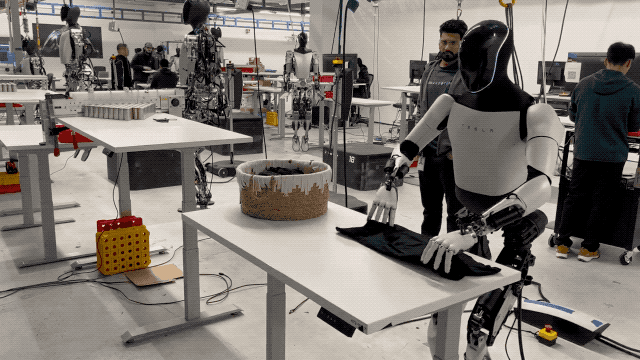 2024 年 1 月,马斯克在 X 上发了段 Optimus 叠衣服的视频,配文「Optimus 会叠衬衫了」。视频里机器人从篮子里取出 T 恤,在桌面慢慢折叠整齐,看起来动作流畅。