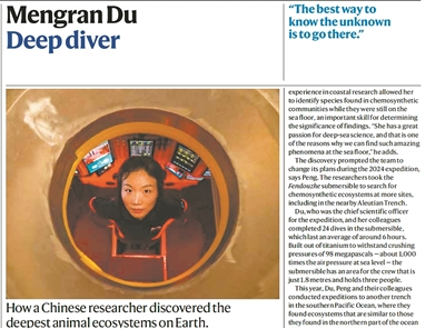 此外,中国科学院深海所地球科学家杜梦然则以深海探索刷新人类认知,她搭乘“奋斗者号”深潜器深入千岛——堪察加海沟9000公尺处,首次发现依靠海底甲烷生存的未知生态系统,为深海化能合成理论提供关键实证。