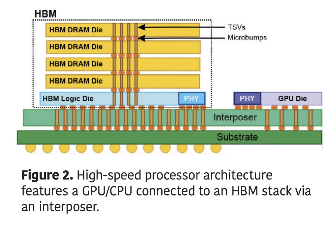 硅中介层的一个主要应用是将高带宽内存 (HBM) 连接到高速处理器(图 2)。每个 HBM 器件本身都是一个由 TSV 构建的 3D 堆叠结构,包含多个 DRAM 芯片和一个逻辑层。单个 HBM 的传输速率最高可达 256 GB/s。硅中介层是将数据流传输到处理器的最有效方式。多个 HBM 可以与 GPU 集成在同一个中介层上,从而实现 1TB/s 或更高的数据传输速率。