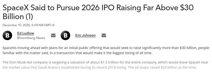 12月10日彭博社消息,SpaceX正在积极推进上市计划,预计融资超300亿美元。