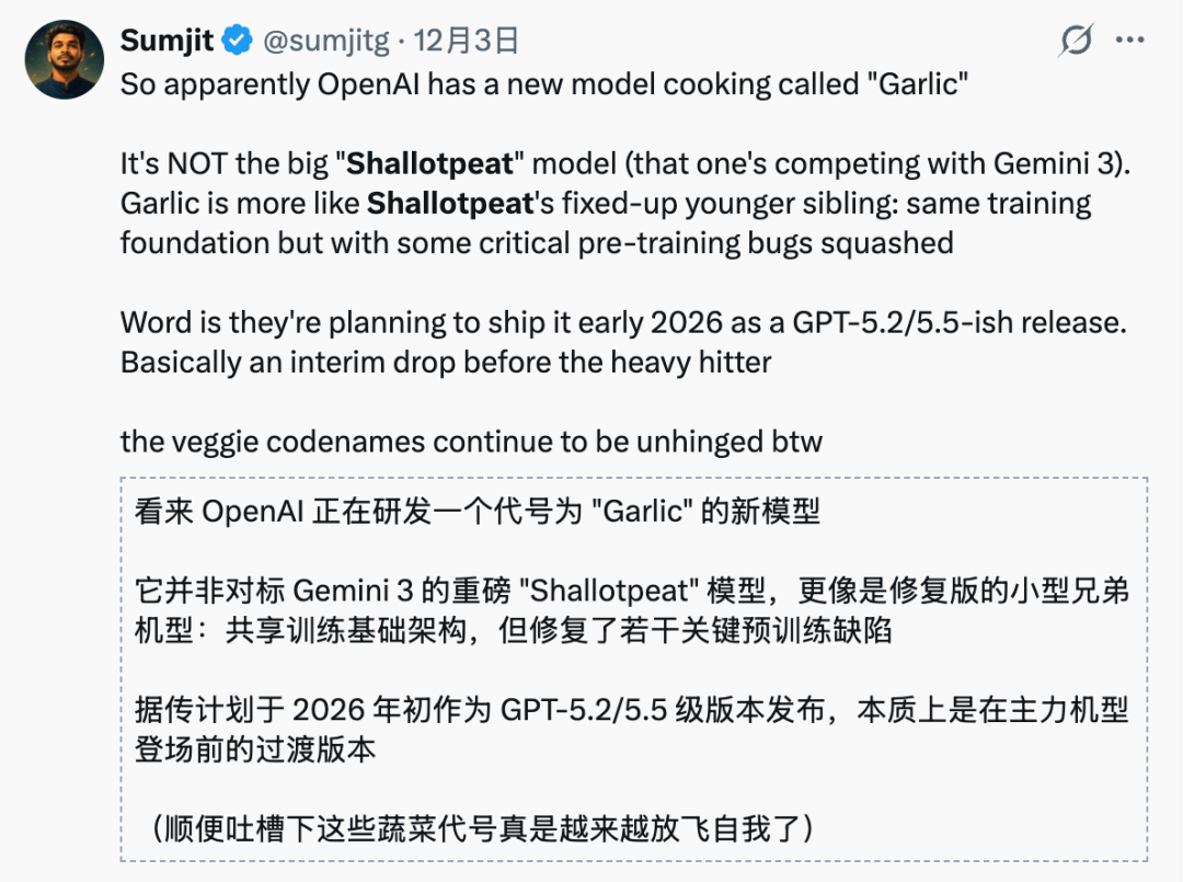 Shallotpeat 是奥特曼去年十月向员工透露的、正在开发中的新模型,本就是为了挑战 Gemini 3 而研发的。