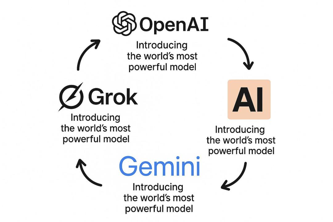 相信许多读者都看过这张图,它形象地展示了硅谷闭源模型陷入的「无限战争」,四家巨头轮流宣称自己拥有「最强模型」,形成了四足鼎立的胶着局面。虽然这只是网友的吐槽,但也侧面反映了目前没有任何一家厂商能够建立绝对的技术统治力。