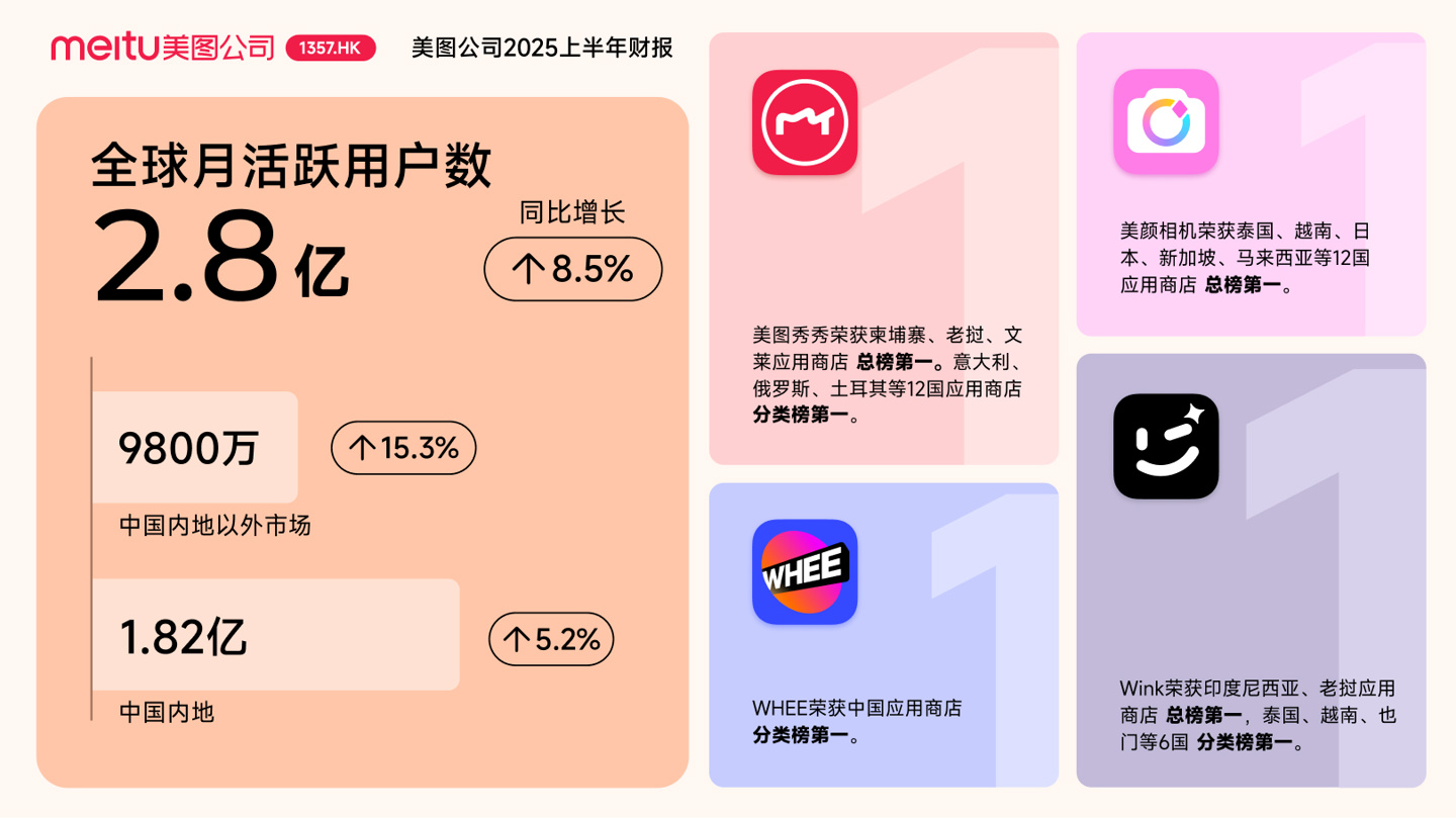 美图公司总收入与净利润的增长主要得益于 AI 应用取得突破,全球付费订阅用户数量提升,以订阅为主的影像与设计产品业务收入快速增长。截至 2025 年 6 月 30 日,美图公司全球月活跃用户数达到 2.8 亿,同比增长 8.5%。其中,中国内地以外市场月活跃用户数为 9800 万,同比增长 15.3%。
