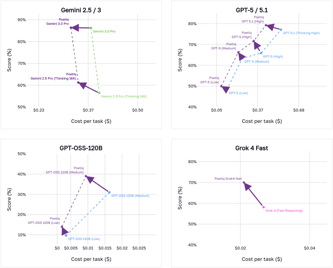为了进一步展示Poetiq元系统的能力,研究人员将其应用到多个来自Google DeepMind、OpenAI、Anthropic和xAI的最新模型上。