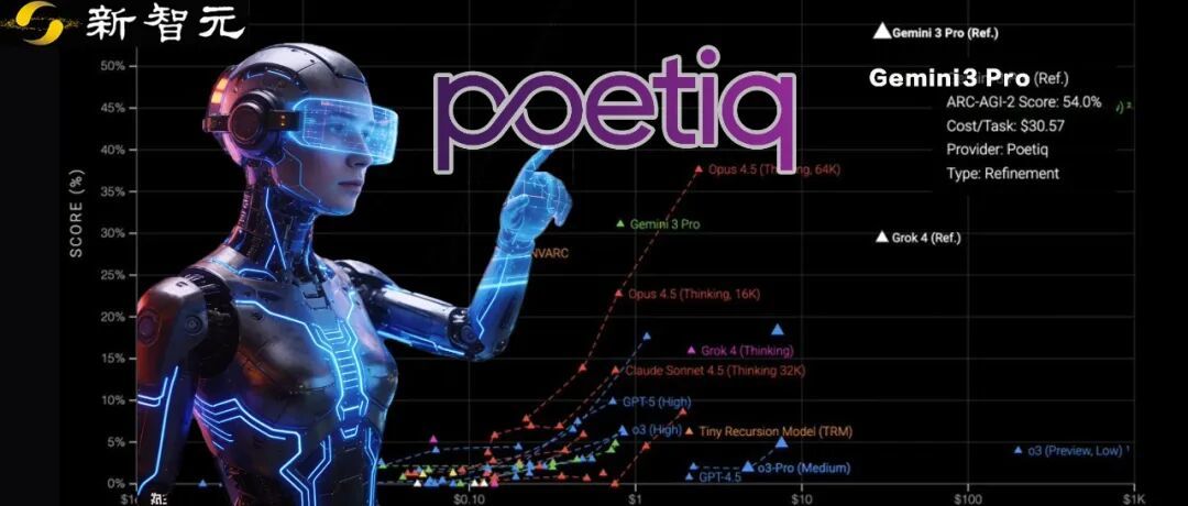 由Poetiq推出的Gemini 3 Pro优化技术,在ARC-AGI-2 leaderboard上创下新SOTA,得分高达54%,每任务计算成本仅31美元。