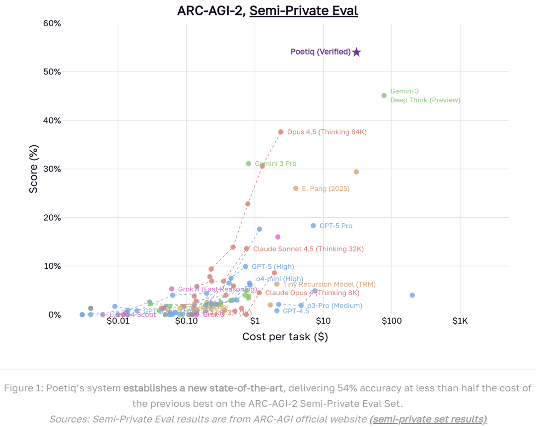 如上图所示,Poetiq系统在ARC-AGI-2半私有评估集上创下新纪录。