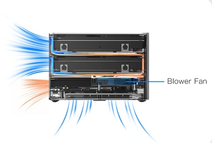 对于双盘位机型,机械硬盘通过导热垫连接到金属托盘,下方小风扇带动气流可以同时给主板和机械硬盘进行散热,从而将整机压缩至 2.25L(IT之家注:飞牛 Evo 2 约为 2.33L)。