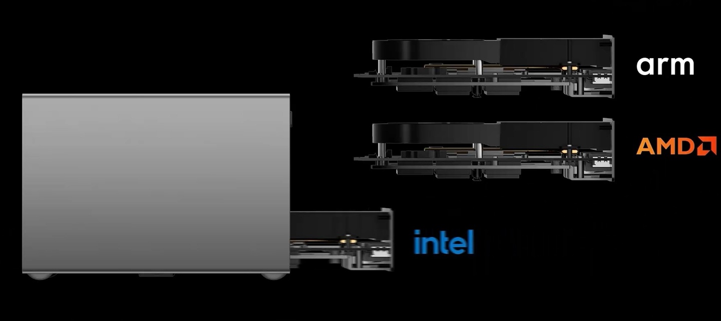 零刻 ME Pro 与飞牛 Evo 2 系同源方案,开创性地采用了 DIY 抽屉式设计,将主板模块化,提供英特尔、AMD、Arm 三种主板可选,方便用户按需升级核心。
